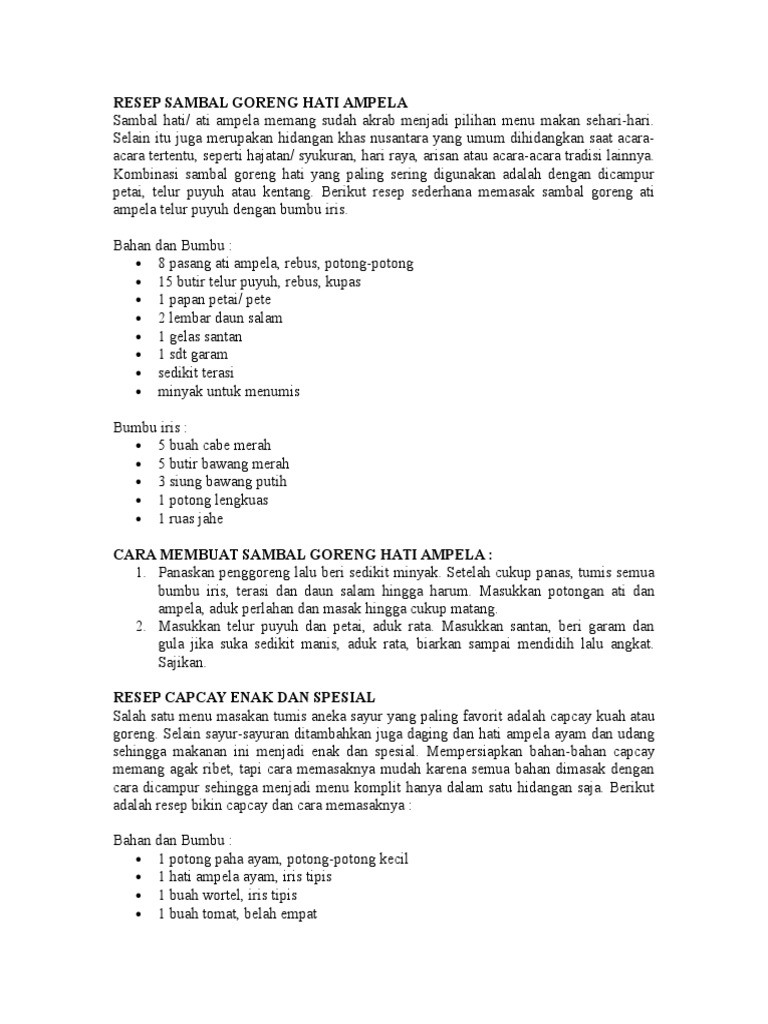 Makanan ini biasanya berbahan dasar hati ayam atau sapi, kentang dan dibumbui oleh sambal yang pedas, terkadang juga ditambahkan petai dalam membuatnya. Selain nikmat di santap, hidangan ini juga termasuk praktis dan mudah di buat. 3 resep sambal goreng ati istimewa, pakai kentang dan telur puyuh! Ada beberapa macam sambal yang sering kita temui, salah satunya adalah sambal goreng ati. Mungkin anda sekarang sedang mencari resep sambal goreng kentang ati yang enak dan praktis. Resep sambal goreng ati ini memakai hati sapi sebagai bahan utama. Resep sambal goreng kentang ati ampela sederhana foto: Resep sambal goreng ati ampela. Sambal goreng kentang hati ampela yang enak harusnya sih punya aroma dan cita rasa yang bisa memancing selera kita. Ada beberapa macam variasi resep sambal goreng ati, seperti sambal goreng ati ampela ayam, ati sapi, ataupun sambal goreng kentang ati. Masukkan ati yang sudah digoreng setengah matang. 5.881 resep hati ampela goreng ala rumahan yang mudah dan enak dari komunitas memasak terbesar dunia! Nah buat kamu yang ingin mencoba membuatnya saat lebaran, resep sambal goreng kentang ini sangatlah mudah lho.